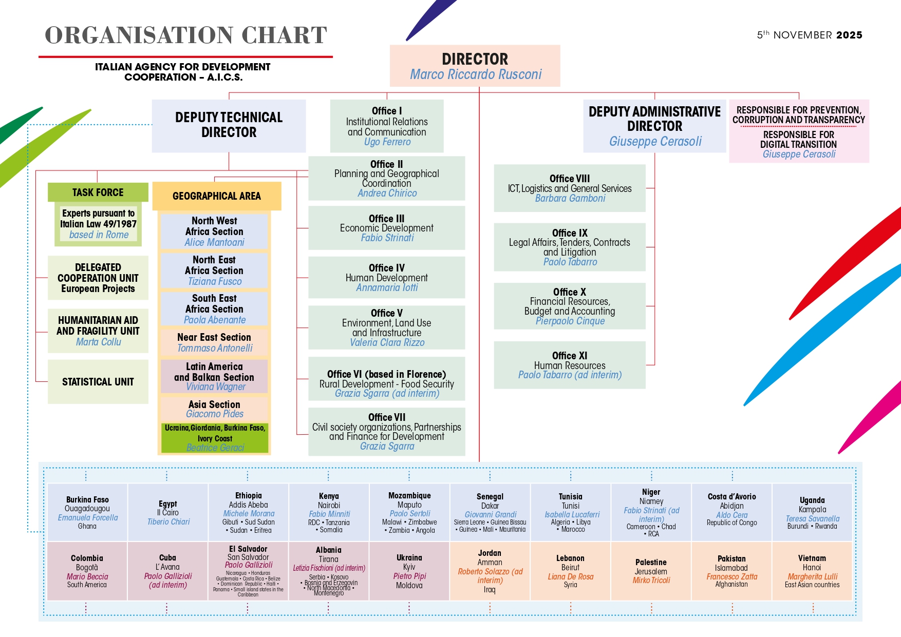 Read more The Italian Agency for Development Cooperation runs a network of 20 field offices for managing operations and initiatives in partner countries worldwide.