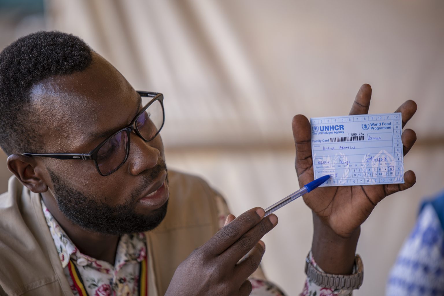 Mentre ci illustra i tesserini identificativi ed i braccialetti che vengono dati ai profughi per dar loro diritto a ricevere gli aiuti alimentari del World Food Programme (Wfp), Francis vede dietro le nostre spalle che nel Centro sta entrando una famiglia di sud sudanesi: camminano lentamente ma con decisione. Sono nove; sette bambini, la loro madre e suo fratello.