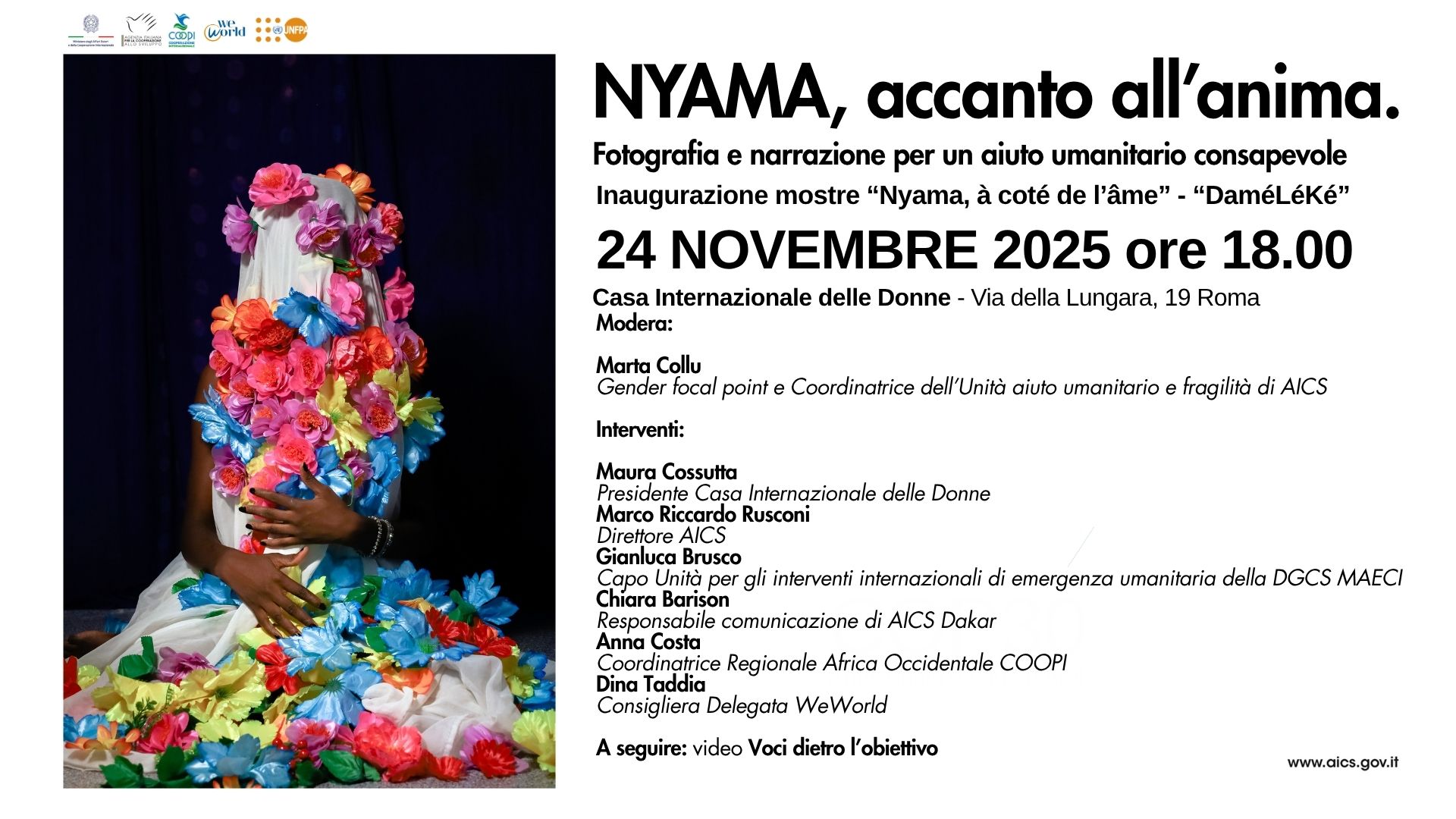 Oltre a Rusconi, alla presentazione della mostra intervengono la Presidente della “Casa internazionale delle donne” Maura Cossutta, il Capo Unità per gli interventi internazionali di emergenza umanitaria della Farnesina Gianluca Brusco, la responsabile comunicazione di AICS Dakar Chiara Barison, la Coordinatrice Africa occidentale di COOPI Anna Costa e Consigliera delegata Dina Taddia di WeWorld. Conclude la Gender focal point e Coordinatrice dell’Unità aiuto umanitario e fragilità di AICS Marta Collu.