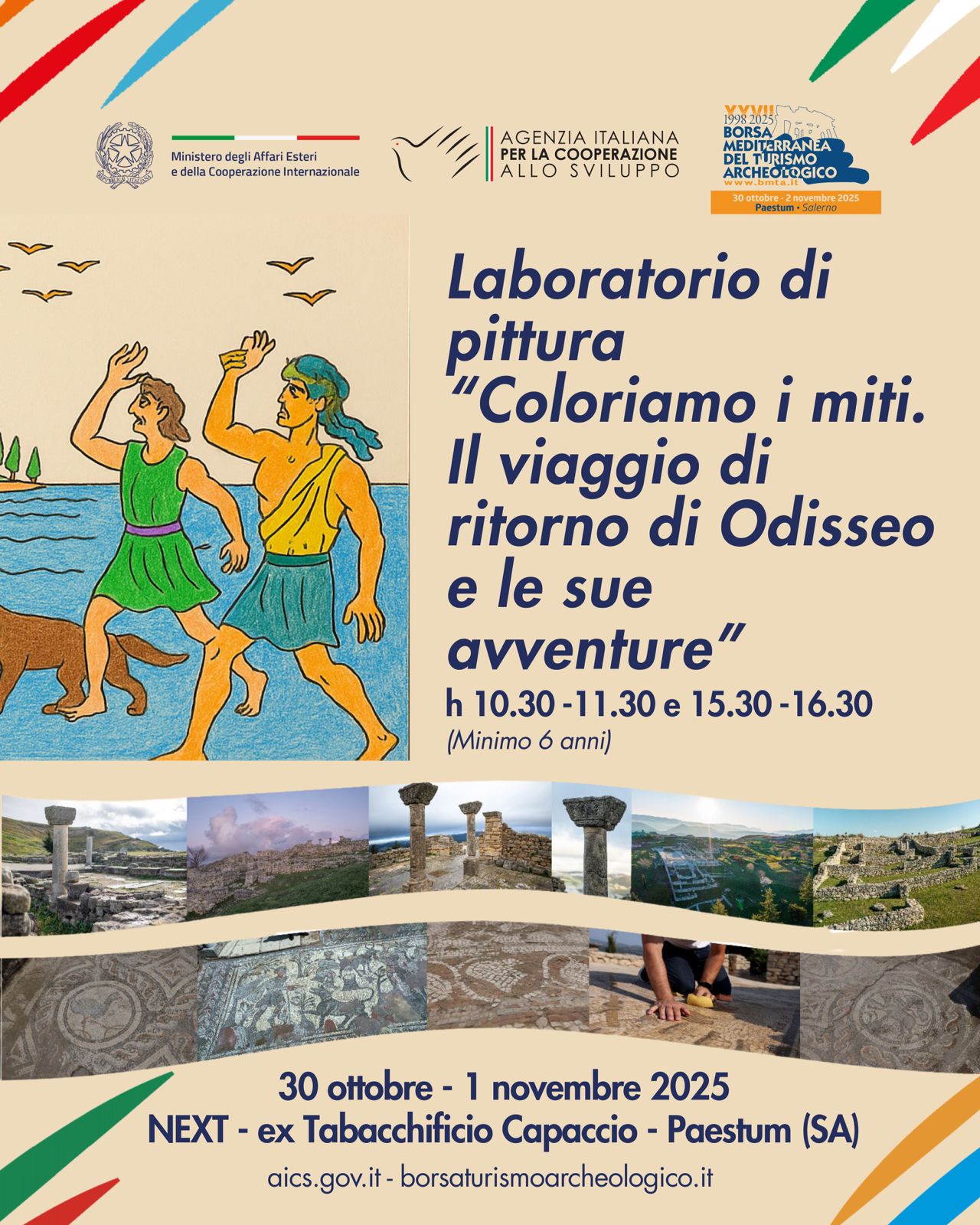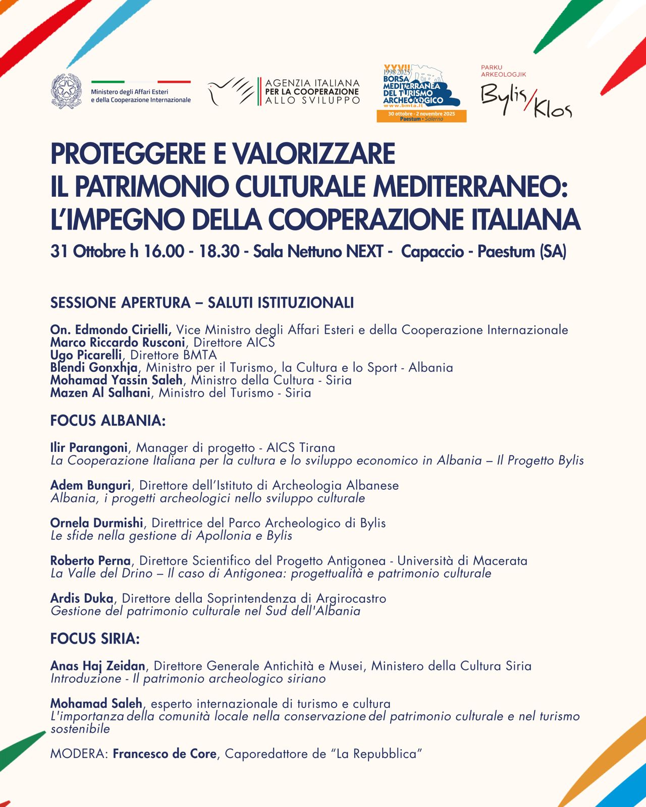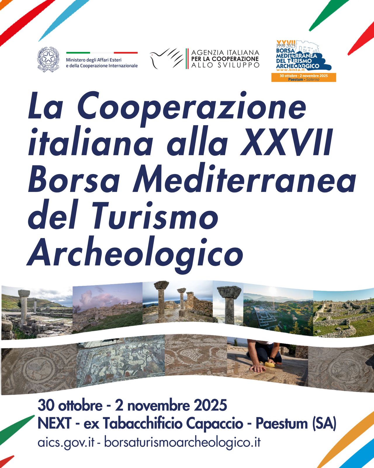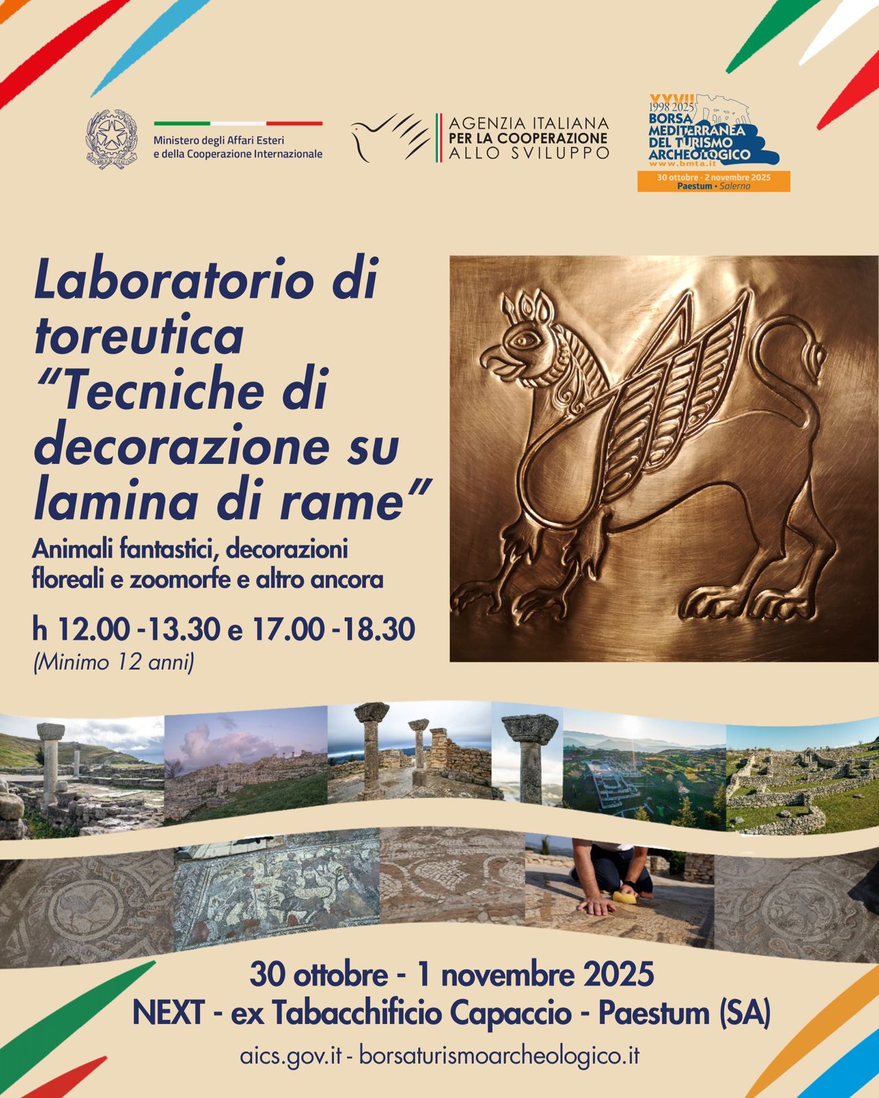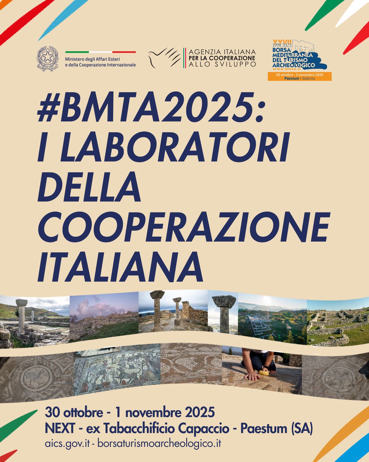 Alla XXVII edizione della Borsa Mediterranea del Turismo Archeologico (BMTA), in programma a Paestum dal 30 ottobre al 2 novembre 2025, il Ministero degli Affari Esteri e della Cooperazione Internazionale (MAECI) e l’Agenzia Italiana per la Cooperazione allo Sviluppo (AICS) presentano una serie di progetti dedicati alla valorizzazione del patrimonio culturale come leva di sviluppo sostenibile e inclusivo, con focus su Albania, Siria, Tunisia, Libia e Marocco. All’interno dello stand MAECI-AICS sono inoltre previsti dei laboratori tematici di metallurgia, toreutica e pittura, pensati sia per ragazzi che per adulti, a cura dell’archeotecnologo Ettore Pizzuti.