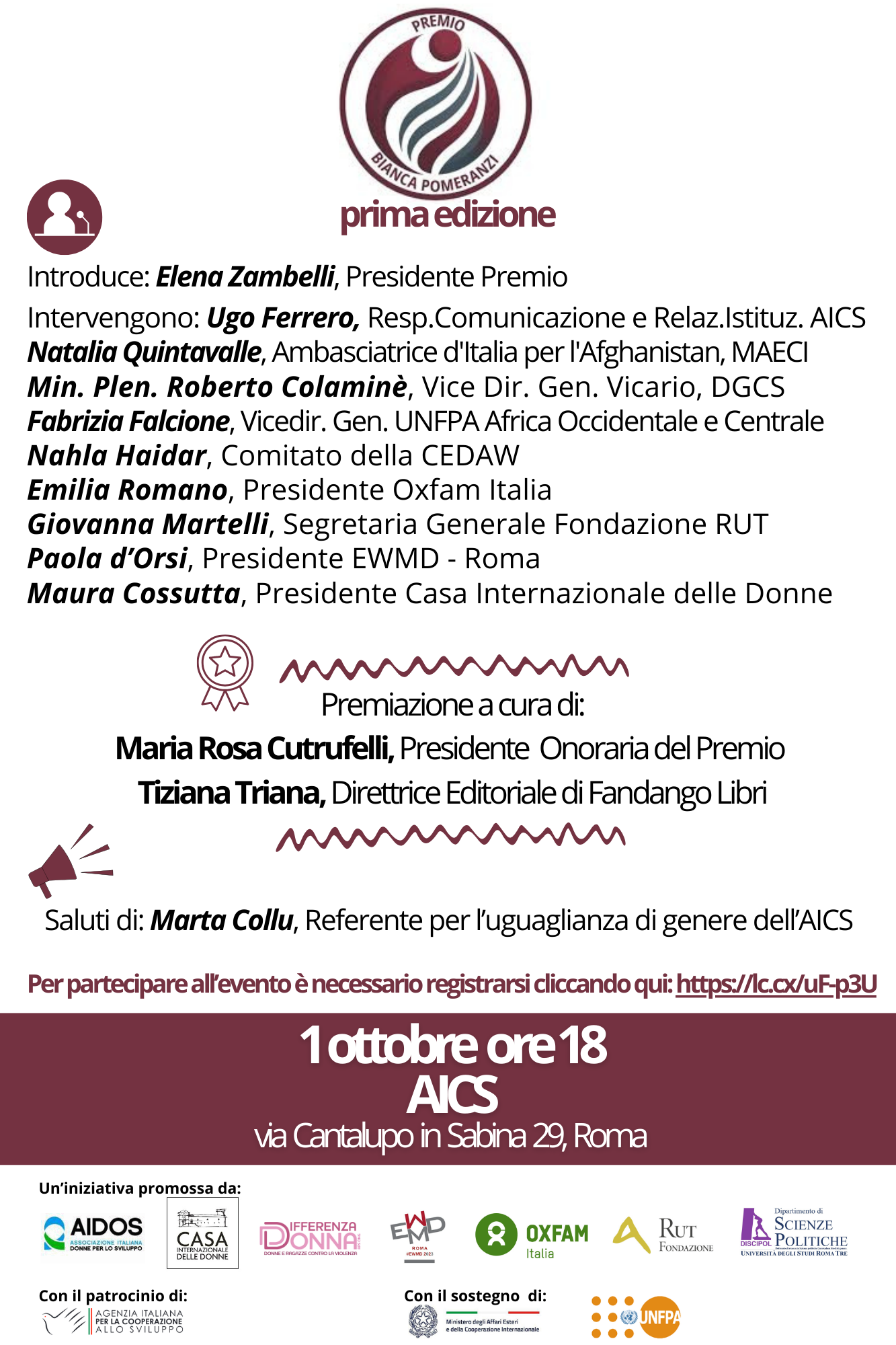 Il 1° ottobre 2024, alle ore 18, si terrà a Roma, presso la sede dell’Agenzia Italiana per la Cooperazione allo Sviluppo (AICS), la cerimonia di consegna del Premio Bianca Pomeranzi – iniziativa nata per costruire un’eredità viva di uno straordinario contributo alla promozione dei diritti e delle libertà delle donne in ambito italiano e transnazionale.