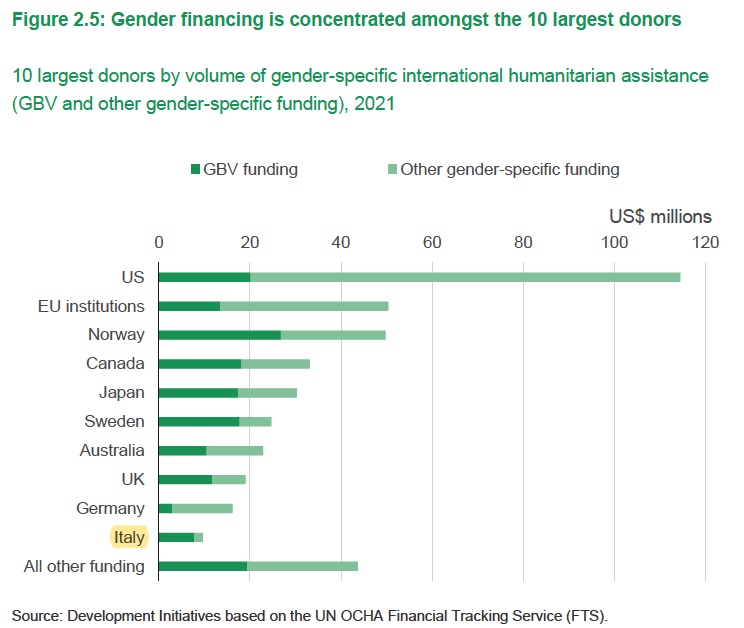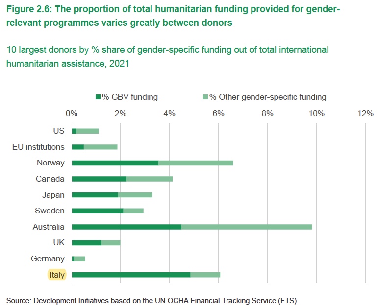 Nel 2021, l’Italia si attesta al terzo posto in termini di percentuale del finanziamento umanitario totale fornito per i programmi attinenti al genere, superata solo da Australia e Norvegia, e risulta tra i 10 maggiori donatori, insieme a USA, Unione Europea, Norvegia, Canada, Giappone, Svezia, Australia, Gran Bretagna, Germania, per volume di assistenza umanitaria internazionale specifica per l’uguaglianza di genere nel 2021.