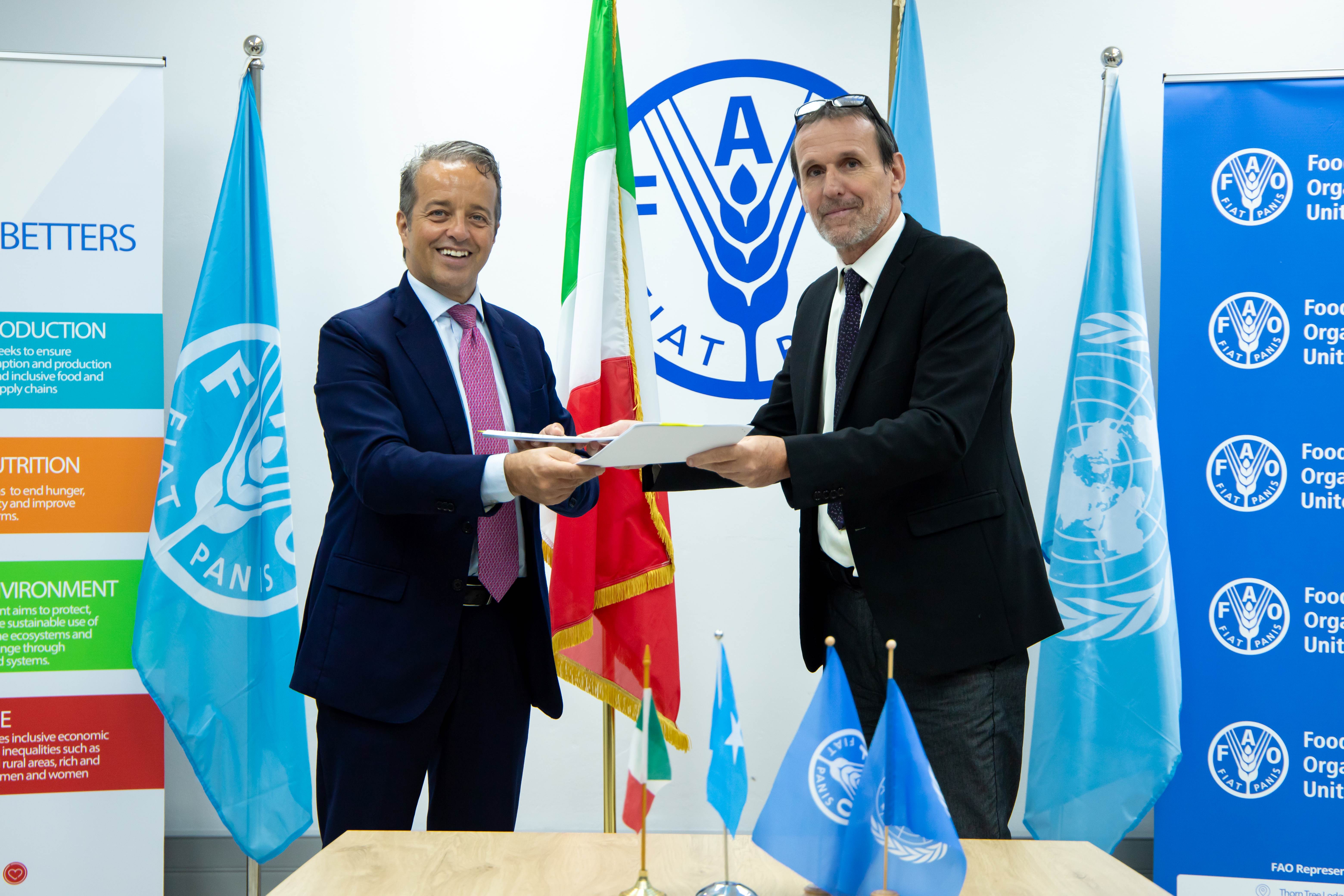 1. A destra, il Rappresentante di FAO Somalia, Etienne Peterschmitt, e a sinistra l’Ambasciatore d’Italia in Somalia, Pier Mario Daccò Coppi, alla cerimonia del firma della nuova iniziativa