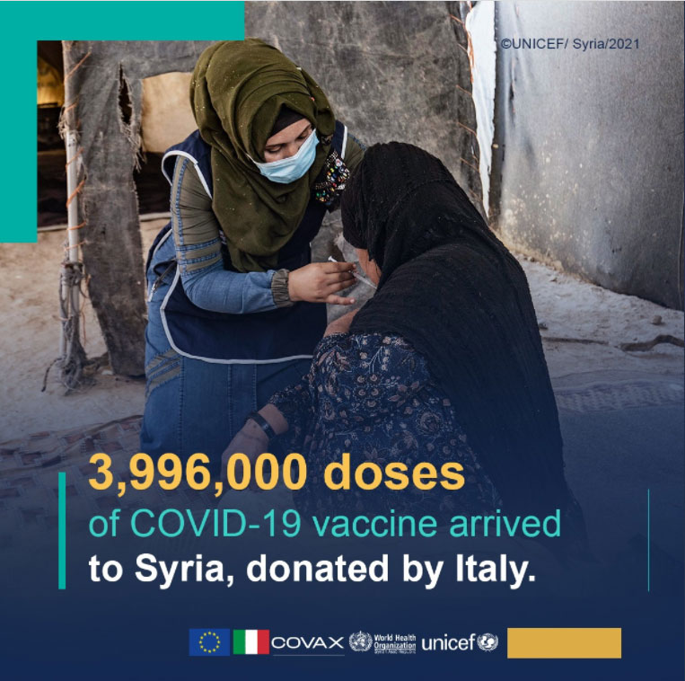 “L’Italia sta donando dosi a COVAX in aggiunta ai 470 milioni di dollari che ha promesso al Gavi COVAX Advance Market Commitment (Gavi COVAX AMC) e questa donazione in particolare permetterà a un gran numero di persone in Siria di accedere subito ai vaccini”, ha dichiarato l’Incaricato d’Affari italiano ad interim, Massimiliano D’Antuono. “L’Italia è al fianco della popolazione siriana e, in collaborazione con la Direzione per gli aiuti umanitari dell’UE, l’UNICEF e l’OMS, sostiene le azioni per affrontare la pandemia da COVID-19 e in generale le conseguenze della terribile situazione umanitaria in tutto il paese”, ha continuato.