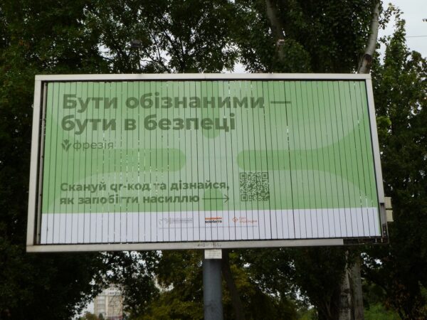 Freesia nasce in questo quadro, per dare un volto umano a tale impegno: per parlare apertamente di violenza, nei luoghi dove le persone vivono, viaggiano, si informano, cercano risposte. La campagna offline ha colorato le strade e le stazioni di Kharkiv, Dnipro e Zaporizhzhia. Cartelloni, poster e affissioni nei centri di accoglienza per sfollati interni (IDPs) riportavano messaggi di incoraggiamento e un QR code che conduceva ad un sito web con informazioni su come riconoscere, prevenire e affrontare la violenza di genere o accedere ai servizi di supporto.
