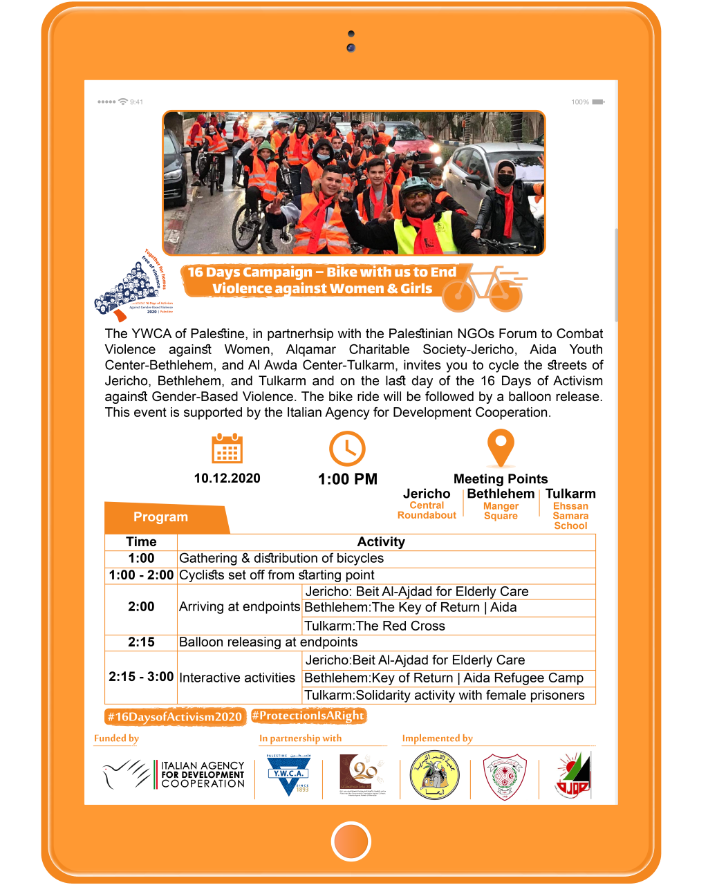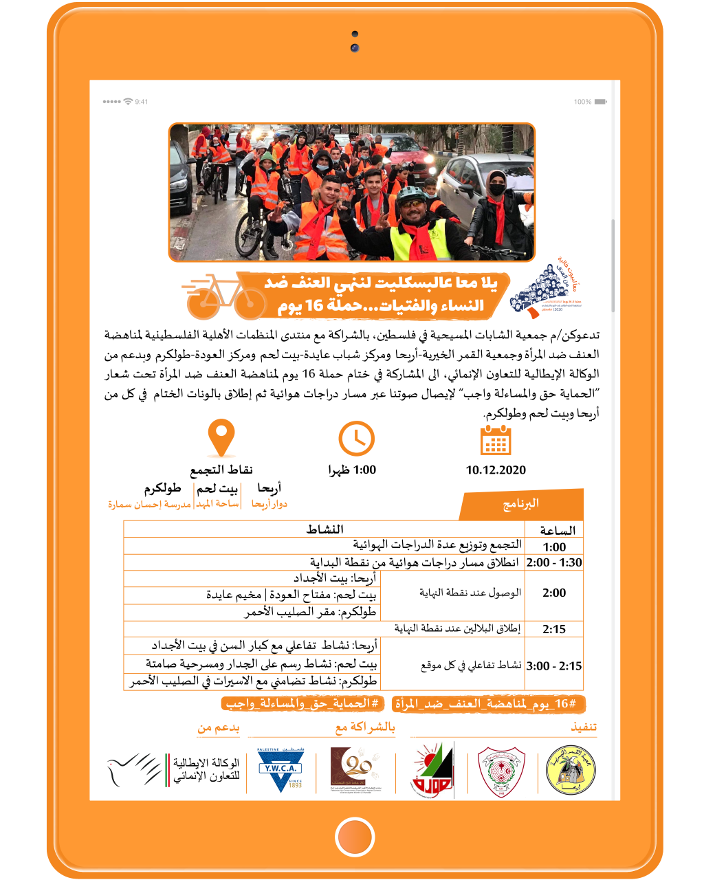 La sfilata di giovani in bici, denominata “Bike with us to end violence against women and girls” (Pedala con noi per fermare la violenza sulle donne e sulle bambine), ha concluso la Campagna dei 16 giorni di attivismo contro la violenza di genere iniziata lo scorso 25 novembre, in concomitanza con la Giornata internazionale contro la violenza sulle donne. L’attività inserisce all’interno di diverse iniziative finalizzate alla promozione e protezione dei diritti delle donne e del loro empowerment economico, tra cui il progetto Welod 3, programma che mira all’accrescimento delle opportunità di sviluppo socioeconomico delle donne palestinesi e alla protezione dei loro diritti mediante un supporto al bilancio del Ministero degli Affari delle Donne (Mowa) e del Ministero dello Sviluppo Sociale (Mosd).