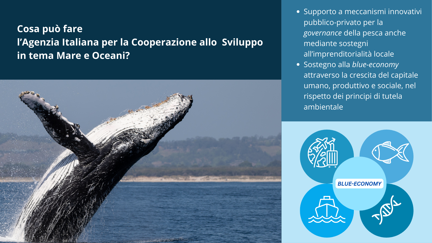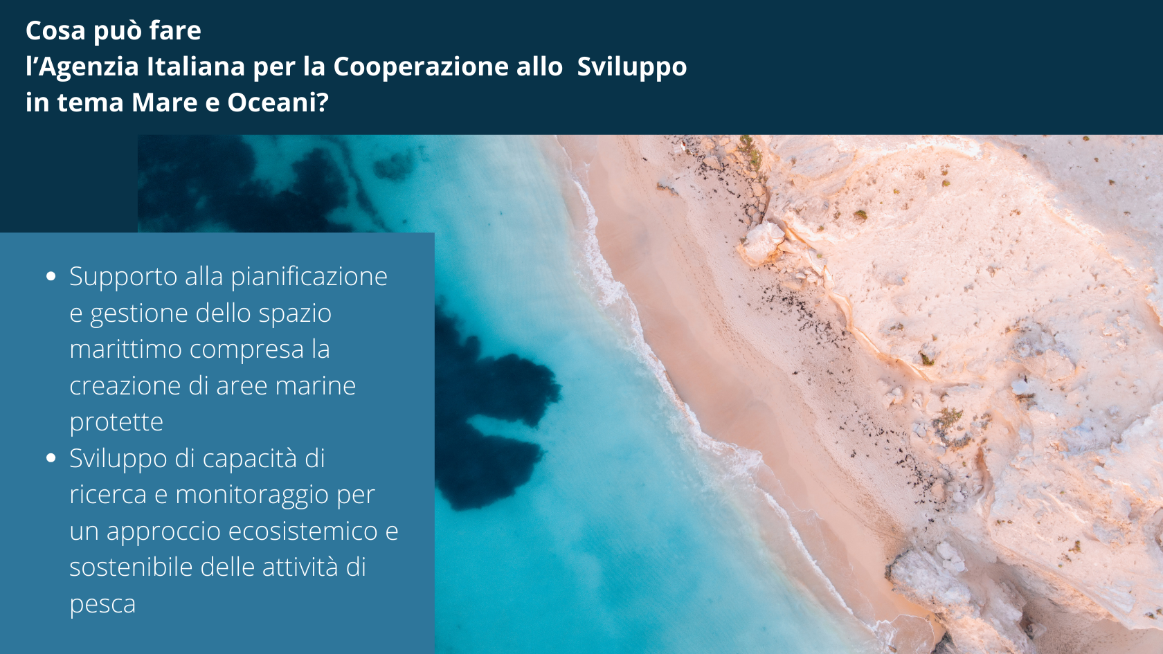 L’attività di cooperazione dell’Agenzia nel settore del mare e degli oceani mette a disposizione dei Paesi Partner le conoscenze e la capacità del Sistema Italia attraverso la promozione di iniziative che spaziano dalla creazione di aree marine protette, alla gestione sostenibile delle attività di pesca, ai sostegni all’imprenditorialità locale per lo sviluppo di modelli integrati e socialmente sostenibili di blue-economy, nel rispetto dei principi di tutela ambientale.
